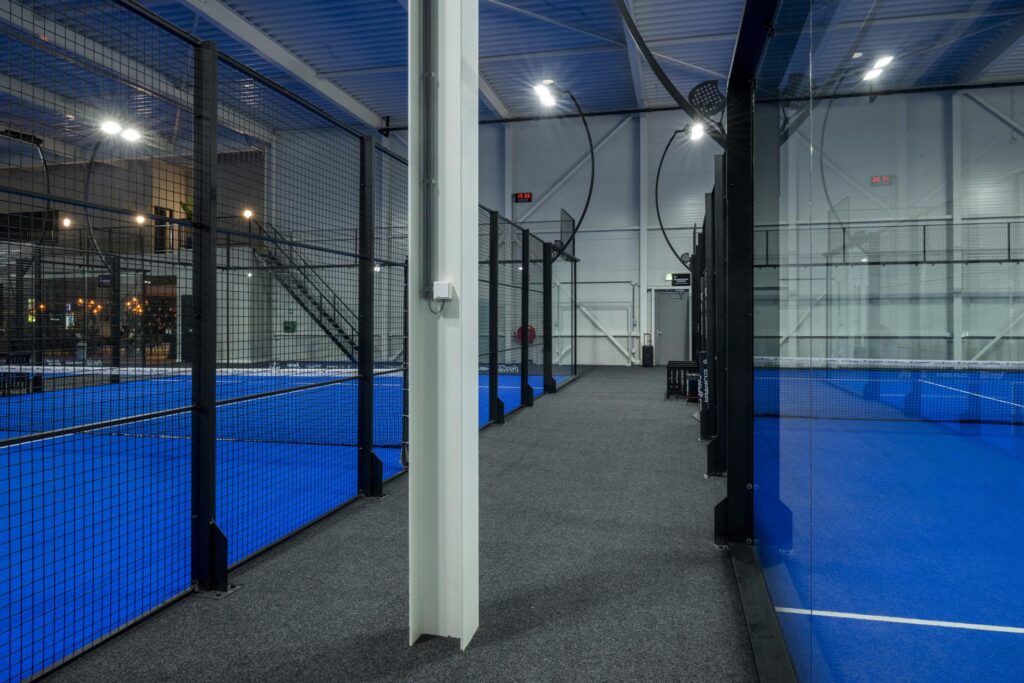 Een imposante hal waarin enkel een entresol gemaakt was, hebben we samen met de ondernemer omgetoverd tot een prachtig padelplein. Met 10 indoorbanen die door een Spaanse partij geplaatst zijn en waar wij de verdere aansluitingen voor verzorgd hebben. Denk hierbij aan de verlichting die over de banen schijnt, de digitale tijdsklokken en de bordjes van de nooduitgang die zeker niet mogen ontbreken. Tussen de banen hebben we de vloerbedekking gelegd en alle overige aansluitingen met betrekking tot de elektra geplaatst.
