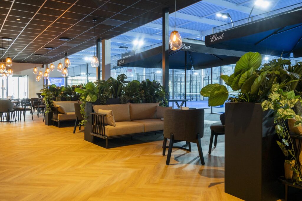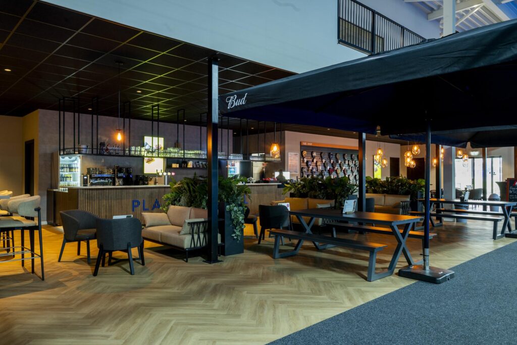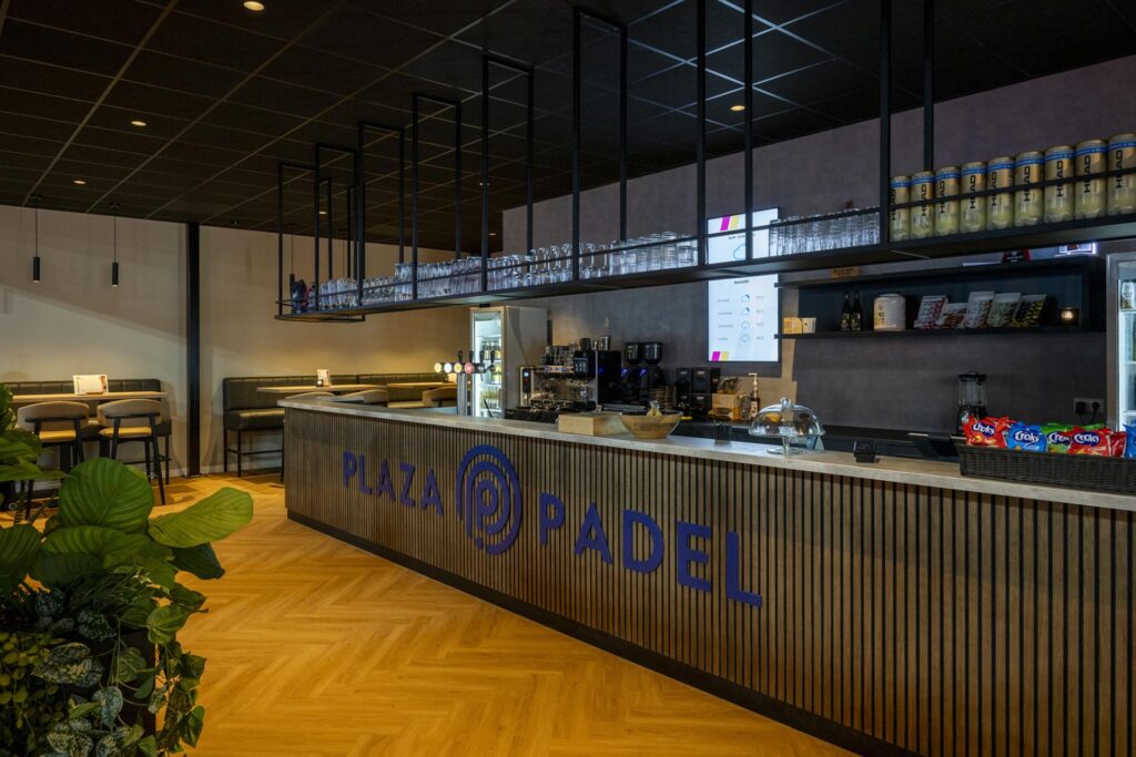 Na een intensief potje padel kunnen de sporters uitrusten in het horecagedeelte. Dit gedeelte hebben we helemaal opgebouwd conform de Plaza Padel formule. We hebben de toiletgroep gemaakt, de bar, zitjes en opslagruimtes gerealiseerd. Achter de schermen hebben we een volledige horecakeuken geplaatst met hierin eveneens terugkerende standaard elementen.