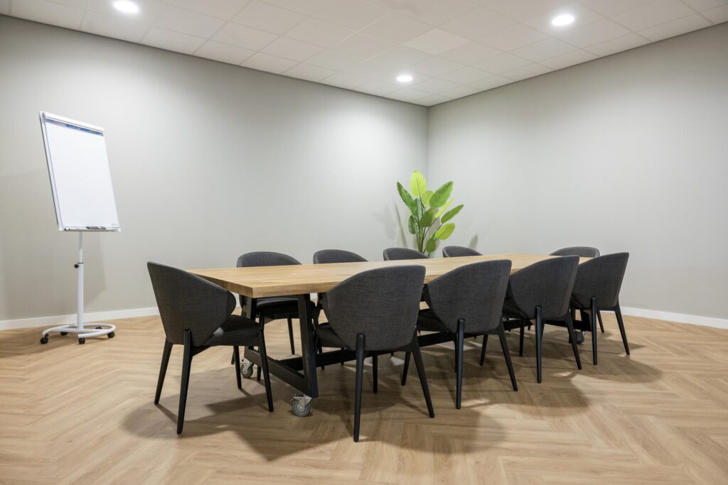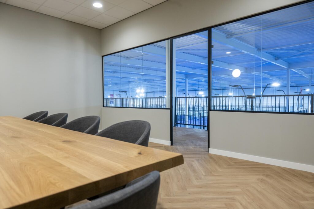 Om naar de eerste verdieping te kunnen gaan hebben wij de trap geplaatst. En ook de balustrade: veiligheid voorop! Op deze eerste verdieping is de vergaderruimte gerealiseerd met een onderhoudsvriendelijke vloer en een groot scherm. Zo kunnen bedrijven eerst vergaderen om vervolgens lekker te sporten met elkaar.